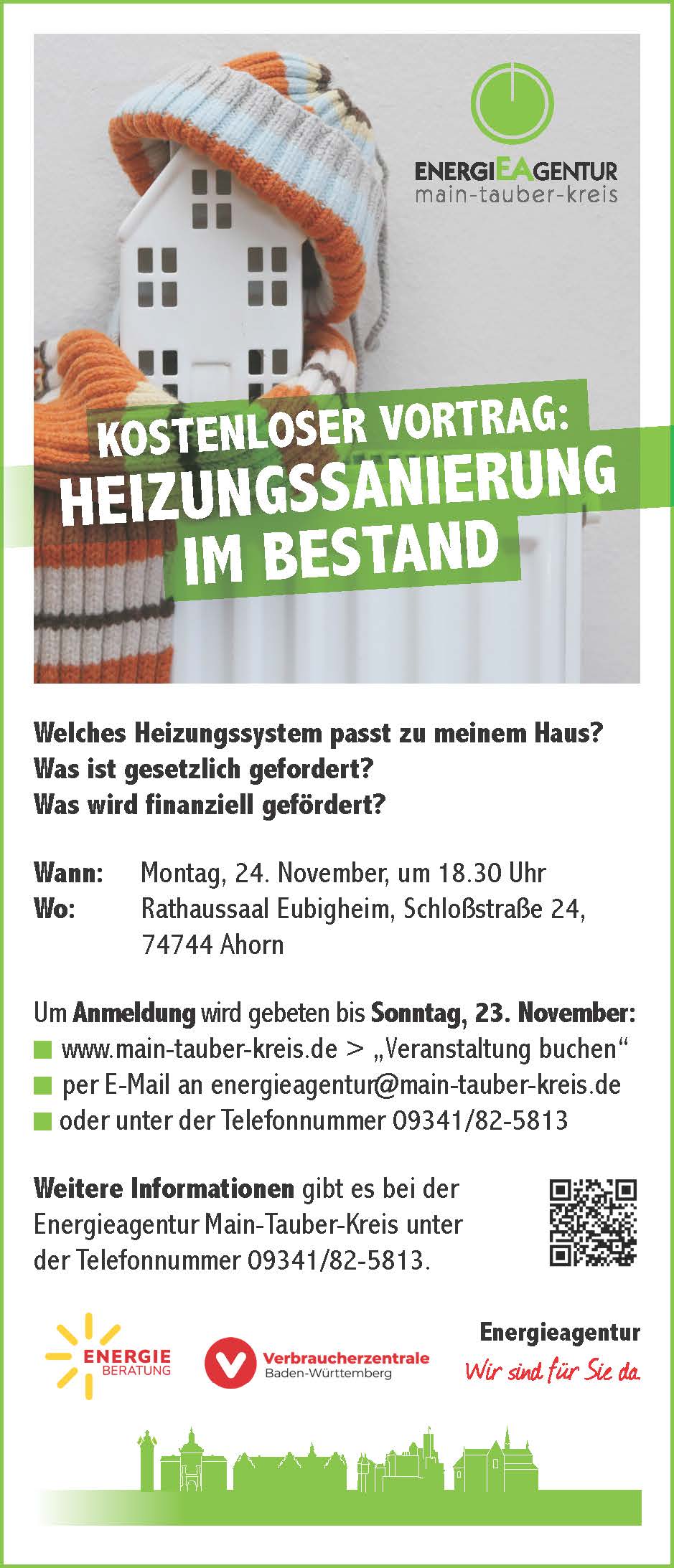 Die Energieagentur Main-Tauber-Kreis bietet in Kooperation mit der Verbraucherzentrale Baden-Württemberg eine kostenfreie Informationsveranstaltung für Bürgerinnen und Bürger zum Thema Heizungstausch an. Die Veranstaltung findet am Montag, 24. November, im Rathaussaal, Schloßstraße 24, in Ahorn-Eubigheim statt. Der Vortrag „Heizungssanierung im Bestand – Welches Heizungssystem passt zu meinem Haus, was ist gesetzlich gefordert und was wird finanziell gefördert?“ beginnt um 18.30 Uhr.
